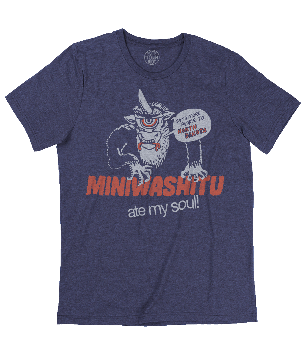 Only true North Dakotans would know about this one. Straight outta the murky depths of the Missouri River comes this legendary river beast. Described in Native oral history as a terrifying cyclops of a creature with a single eye, a back like a buffalo, A distorted frontal horn, and a temper like your ex. According to Dakota lore, even seeing Miniwashitu could drive a person mad. So naturally... we put it on a t-shirt. If you go looking for this cryptid be warned, he'll take your SOUL!