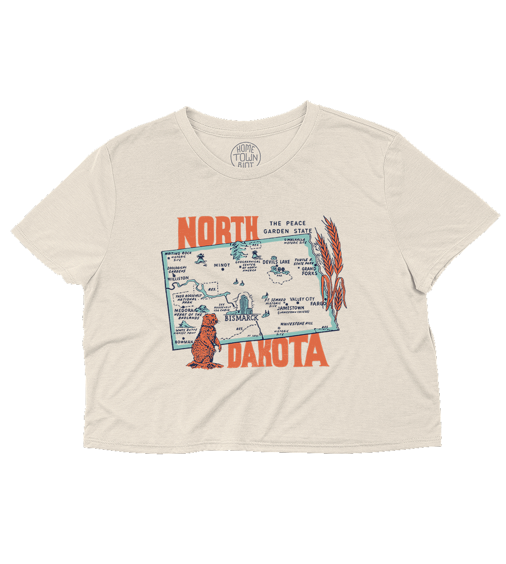 Our North Dakota crop top packs in all the road trip energy of the Peace Garden State, minus the length. It’s got that retro map look, a nod to the International Peace Garden up north, and just enough edge for wandering through the Badlands or kicking it in Bismarck. Cropped, comfy, and made for wherever you're headed.