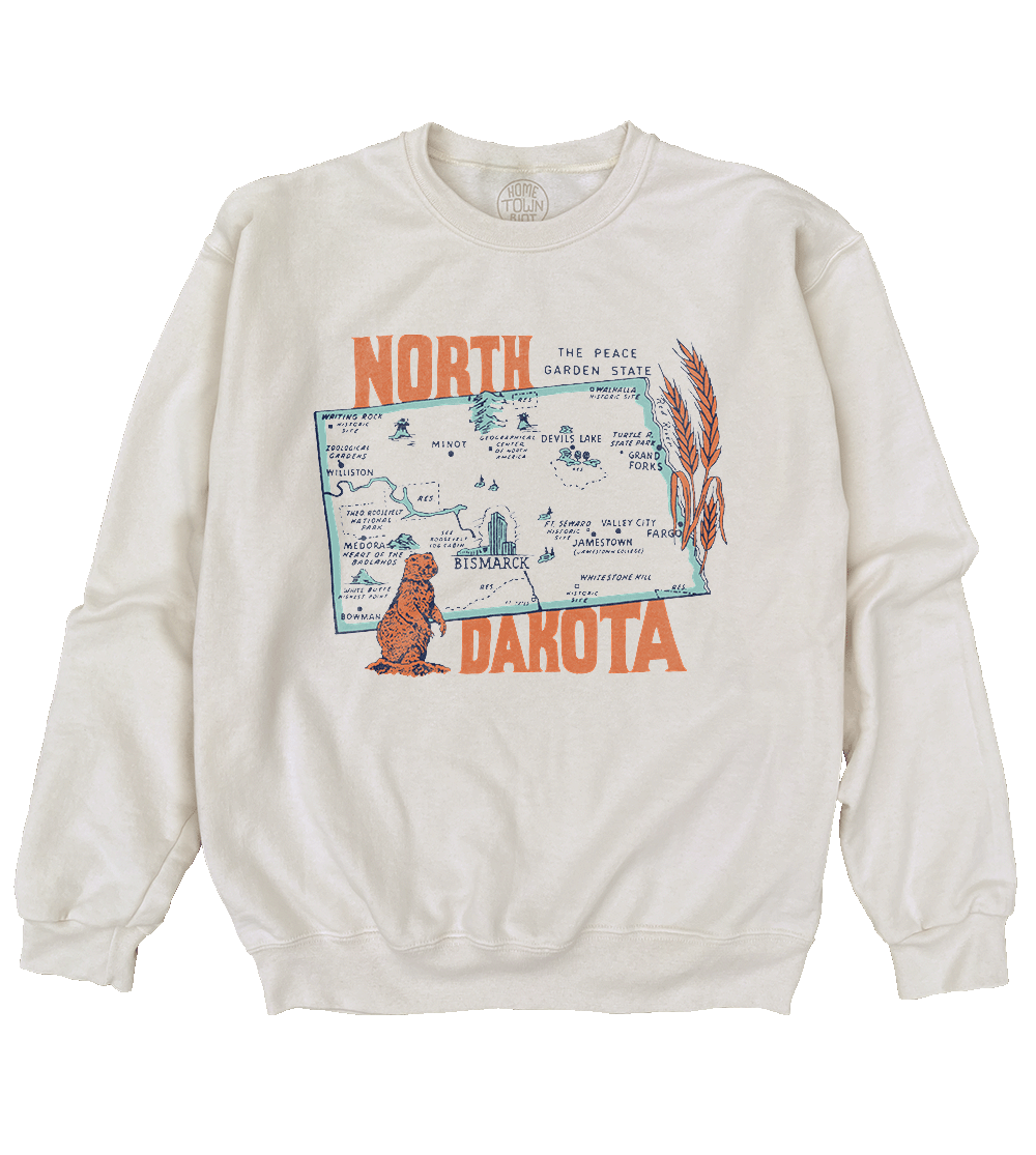 Warm up to the Peace Garden State with our cozy North Dakota sweatshirt, featuring a vintage-style state map and major road trip energy. From the quiet beauty of the International Peace Garden to the rugged terrain of Theodore Roosevelt National Park and the Badlands, this one's built for folks who actually go places. Layer it up in Bismarck, wear it out in Minot, our retro North Dakota crew's ready for the long haul.