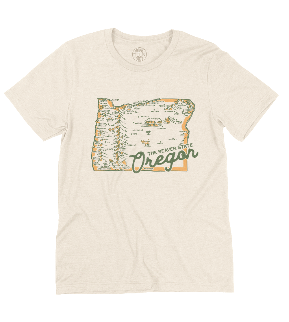 Our Beaver State Oregon tee brings the whole damn state of Oregon with you. From Portland’s bridges to Bend’s high desert, the Columbia River Gorge to Crater Lake, and all the way down to the redwoods near Brookings, it’s all here. Mount Hood, the Oregon Dunes, Smith Rock, and the coast... Wear it and rep every wild, weird, and beautiful mile.